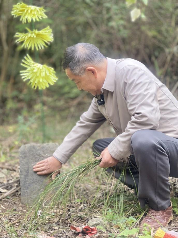 馮美成蹲下身,用手拂去碑旁的雜草與落葉。他動作輕柔,仿佛在照料一位安睡的長輩,“這位朱子清烈士,從幾千里外的浙江來,把生命永遠留在了我們金盆架。”他的講述將時光拉回到烽火連天的1941年。