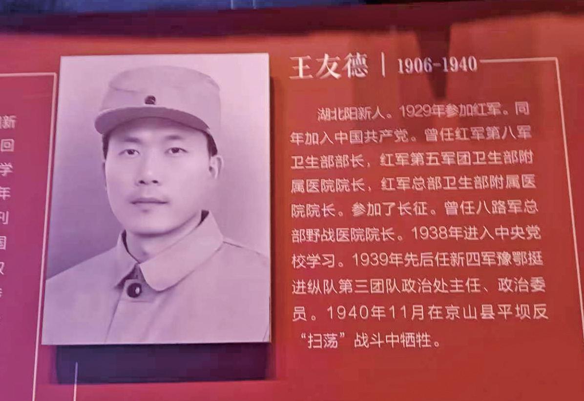 1929年,王友德從這里走上革命道路,最終在京山縣平壩反“掃蕩”戰(zhàn)斗中壯烈犧牲,年僅34歲。他的一生短暫而輝煌:曾擔(dān)任八路軍總部野戰(zhàn)醫(yī)院院長、新四軍豫鄂挺進(jìn)縱隊(duì)第三團(tuán)隊(duì)政治委員……他的一生,是醫(yī)者的仁心,更是戰(zhàn)士的赤膽。