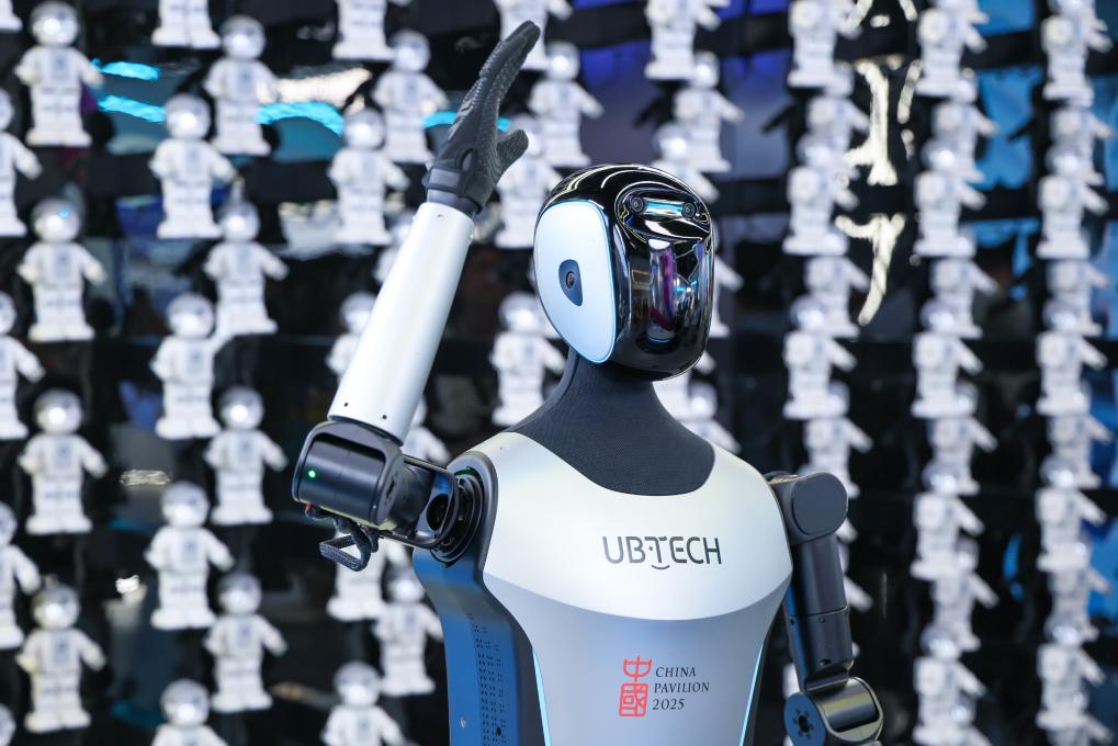 △ 2025年4月23日,在深圳優(yōu)必選科技展廳內(nèi),商用版人形機(jī)器人Walker C向觀眾揮手致意。